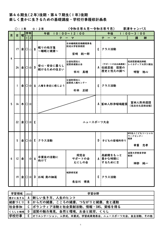 基礎講座履修計画 草津キャンパス後期 〖令和7月4月~令和7年9月〗