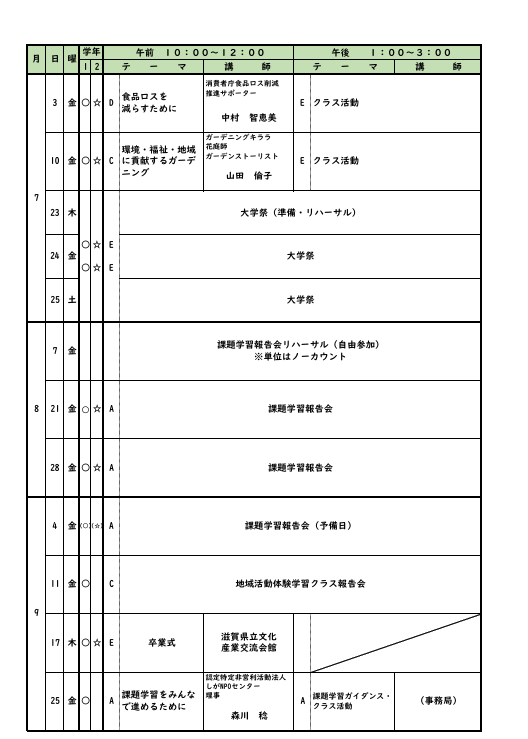 2年生に進級しました。基礎講座履修計画 草津キャンパス前期
