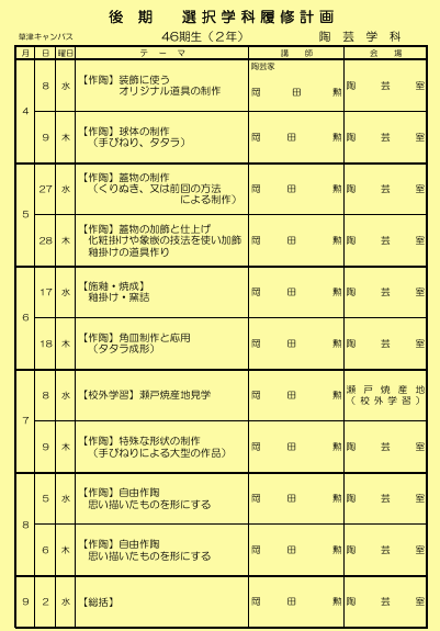 ◆陶芸学科の授業は、1年生は月曜日と火曜日を主に登校、2年生は水曜日と木曜日に登校する。