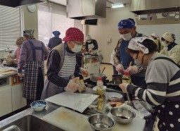 | ①調理実習風景 | ②完成した郷土料理 | ③昼食風景 | ④講義風景 | ||||||