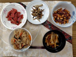 ・午前は、講師の清水満里子滋賀栄養士会常務理事のご指導で、郷土料理(しょいめし・えび豆・小鮎の佃煮・赤こんにゃくの煮物)を各班毎に調理しました。 ・各班で調理した郷土料理を昼食にいただいた後、午後からは清水先生から健康的な食生活などについてご講義いただくとともに、今後行う湖国の味カルタ作りの要領について説明していただきました。 |