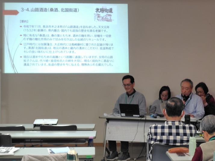 ・レイカディア大学では、グループで調査・研究を行うことを通し、地域課題の抽出や仲間づくり・まちづくりの取組み方法を身につけるため、課題学習が実施されます。 ・46期地域文化学科では、令和7年(2025年)9月に各学生が興味を持つ分野でグループ分けを行い、グループ毎にテーマ、具体的な内容、役割分担、フィールドワーク先等の検討を行いました。その後、著書・文献等で研究を行うとともに、テーマに関わりのある現地に実際に出掛け、フィールドワークを行って内容を深めていきました。 ・最終的には、課題学習の成果を「課題学習報告書」としてとりまとめるとともに、令和8年(2026年)8月の課題学習報告会で全学生の前で発表を行うことになりますが、それに先立ち、中間報告会を開催し、クラスメンバーの前で各グループが発表を行いました。 ・発表のテーマとグループ名は次表のとおりです。また、各グループの発表後、講師の旅行作家西本梛枝氏にご講評いただき、最終報告に向けてご助言をいただきました。