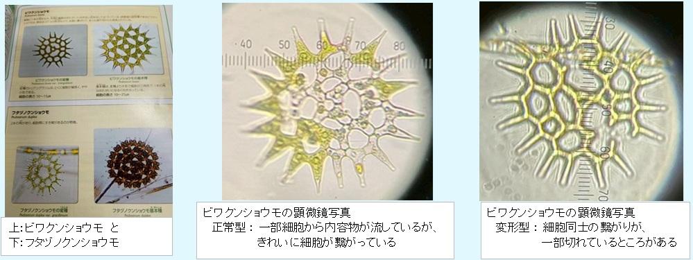 ビワクンショウモの形態と琵琶湖の水質変化について ビワクンショウモは琵琶湖固有種で、細胞が平面上に規則正しく集まり「勲章」のような群体を形成する 植物プランクトンで、夏から秋にかけて琵琶湖全般にみられる 群体の外側には、1本の突起を持つ ⇔ 突起2本の場合は、フタヅノクンショウモ という別種 ・村居先生の見解では、富栄養化等琵琶湖が汚れると形が崩れた変形型が多くなる 細胞の繋がりが切れたり変形した型は、2000年頃をピークに減少しつつある ・顕微鏡を使って、長浜港で採取した水の中のビワクンショウモを正常型/変形型に区別して数えた 数十年ぶりの顕微鏡は、接眼レンズを覗き過ぎて目や頭が痛くなったが、ワイワイと楽しくできた 結果 : 変形型の割合 22.7%(35/154 個)で、2000年頃の50%強の半減以下だった ![]() ![]() |