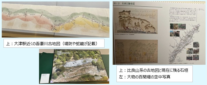 講義 川を描く、川をつくる ~古地図で昔の堤をさぐる~ ・川:地表を削り蛇行して流れる場所を変え、土砂を運び川下に堆積させて海岸・湖岸をつくる 洪水で水があるれると水が流れやすい場所を通り、新しい河道になり、川の位置が変わる →かつての川の経路=「旧河道」、現在も一部地表に残されている ・洪水は発生しやすかった→奈良の寺院建造、日々の燃料のため、山の木々を伐採して”はげ山化”していた ・人は、洪水を防ぐために堤防を創った→16世紀以降、大名等大きな普請ができる支配者が現れた 堤防により川は固定されてきた→堤防や上流の土砂を止める堰堤など大変な労力で普請してきた ・普請の計画、結果など江戸以降地図を作成して記録した(藩等が年貢米をとるため川や堤を管理した) 洪水の範囲、様子を描き、堤防や水の勢いを弱める構造物(蛇籠等)を記載して管理していった ・比良山系では大物の百間堤等の堤防・シシ垣・土石流を防ぐ石垣が今も確認できる ・天井川は滋賀県に多数存在→脆い花崗岩の土砂が溜まるたび堤防を積み上げたため川底も高くなっていった 古地図は、表現の仕方・対象やその変化を確認することで歴史や過去の自然環境を知るヒントを与えてくれる その他、琵琶湖博物館の常設展示を回って、琵琶湖について、いろいろと知識を習得した ![]() ![]() |