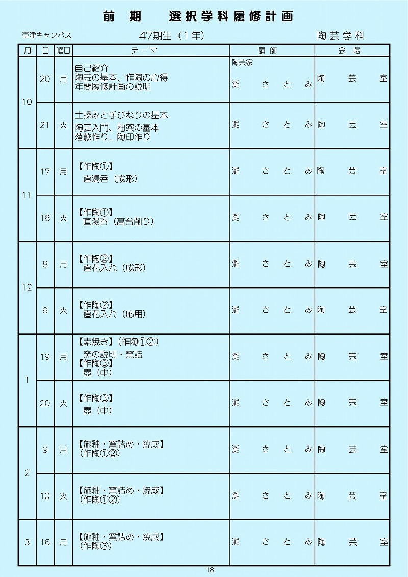 47期陶芸学科 学習内容選択講座 1年(座学、作陶Ⅰ~作陶Ⅸ) |