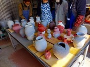 | 概 要 | 2㎏の粘土で挑む、存在感のある壺づくりです。前回の花入れを作った時と同じく「高台なし」のスタイル。底の厚みは約1㎝。一段目は少し太めの紐を使用しながら手びねりで積み上げていく。一番神経を使うのが「外側へ広げていくライン」 外側に広がった形は粘度が自分の重さに耐えきれず「垂れ」が生じてきてしまいます。垂れてきたらドライヤーで少し乾すなどして、無理に積み上げないこと。 本日は半分で終了。口辺部を乾かないように処理して翌日は続きから始まります。 |