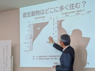 湖・沼・池の違いは?という問いかけから、前半は琵琶湖に住む貝類(巻貝、二枚貝)、甲殻類(十脚類、短脚類、等脚類)など多くの固有種が、沿岸帯や深底に分化して生息する点を紹介。 後半は琵琶湖に生息するプランクトンと光環境、補償深度の概念から「湖」の定義を説明することで、琵琶湖に対する理解を深めることができました。 ![]() |