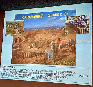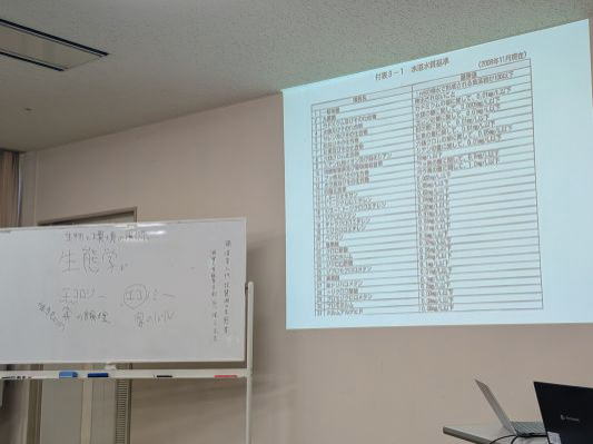 | [学ぶ] 琵琶湖の生態学 | 生態学とは生物と環境の関係を扱う学問で、湖の様々な水質基準、富栄養化の仕組みを通して、水中環境がどのように評価・管理されているかを学んだ。富栄養化は窒素やリンの増加により植物プランクトンが増殖する現象で、水質悪化につながる一方、魚類資源の増加という側面も持つ。 豊かな湖とは、人が利用しながらも生態系が保たれ、「泳げる・飲める・食べられる」環境を目指すことで、そのためには、治水や水質浄化技術だけでなく、湖岸や水草など生物の生活の場を守る視点が重要である。 ![]() ![]() |