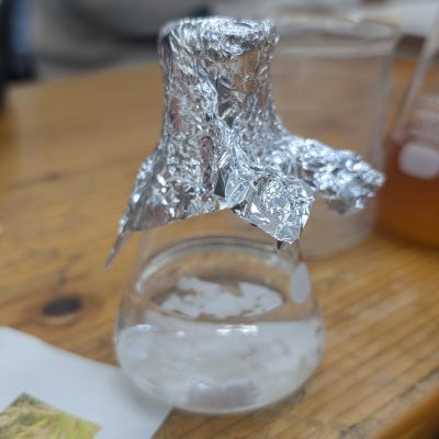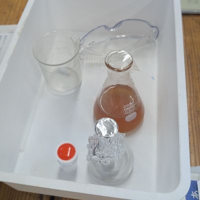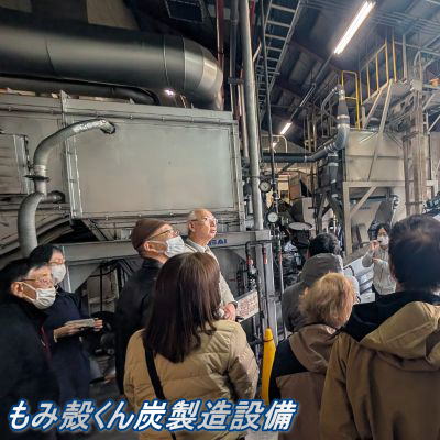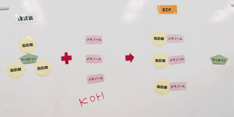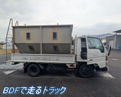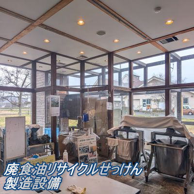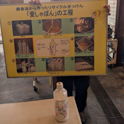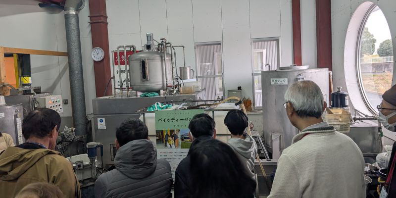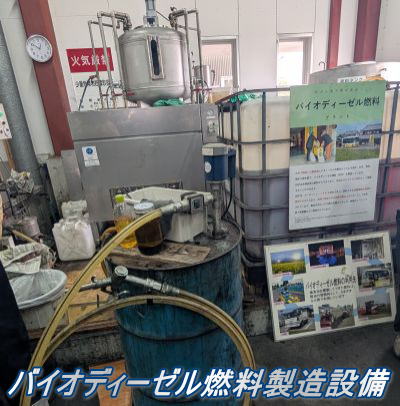 | 午後:【体験】BDF(バイオディーゼル燃料)製造実験 ・廃食油を原料にバイオディーゼル燃料を模擬的に作る (1)酸化カリウムをメタノールに入れ、まぜ棒でつぶしながら混ぜる (2)廃食油を入れ、磁石を投入 (3)実験装置上で加熱しながら約1時間攪拌 (4)静置すると上層(BDF)と下層(グリセリン、褐色)に分離 【施設見学】 (1)BDFで走るトラック (2)BDF発電機 (2)廃食油リサイクルせっけん「愛しゃぼん」製造設備 (3)お米のもみ殻をBDF燃料で着火し炭化した「もみ殻くん炭」製造設備 (4)バイオディーゼル燃料製造設備 (5)菜たね油「菜ばかり」製造設備 |