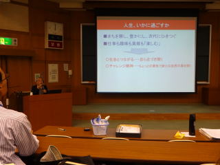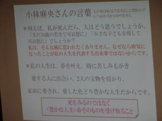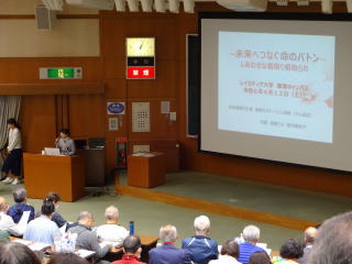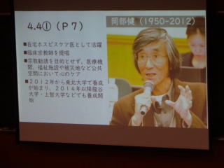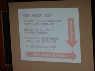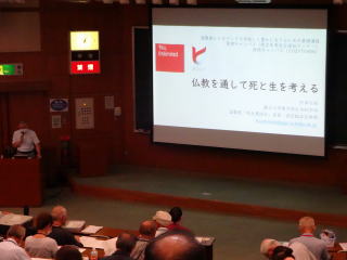 先生から最初に、お坊さんがいる病院があることを紹介されました。日本では5病院、京都には2病院もあります。病院はホスピスで終末期の患者さんに対して疾患による痛みや精神的な苦痛を緩和するための施設です。その精神的な苦痛を緩和する役目がお坊さんです。