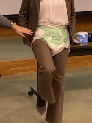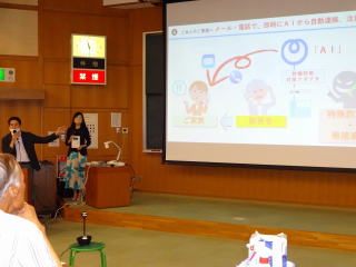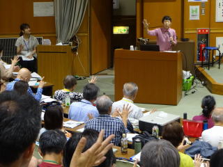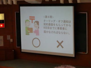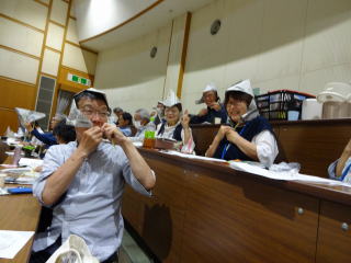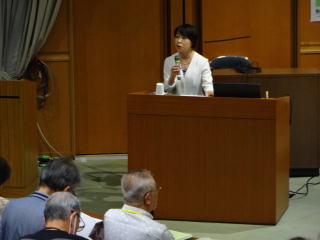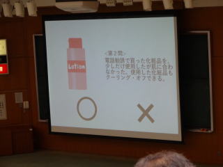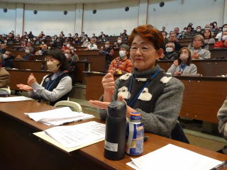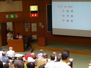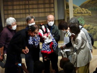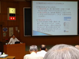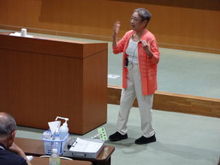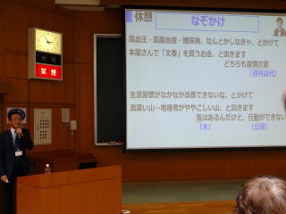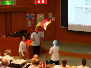 次は、実際に動作コオーディネーションの能力を、レイ大学生の二人がステージの前に出て、スカーフキャッチ(投げ上げたスカーフのキャッチ)やバランス運動を行いました。スカーフキャッチは上手くできて、年齢に負けないハツラツとした動きを見せられてました。