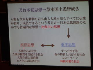 ところで、東洋思想は悉皆成仏と言う言葉で言い表わされているように全てが平等、他の物質と共存する社会、スローライフ、持続可能社会に対し、西洋思想は人間中心の社会、人間が物質を支配する社会、大量生産で大量消費、モノ中心の経済社会。野球選手のイチロウがアメリカで日本との違いを聞かれたとき、モノを大切にしない国だと言ったそうだが、西洋と東洋の違いを端的に言った言葉ですね。