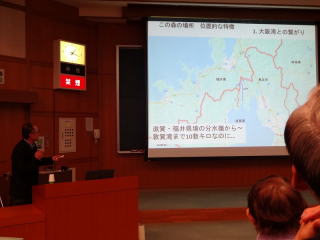 講師の加藤氏が出版された「水と祈りの近江を歩く」の中に書かれているが、滋賀県は日本の縮図だと言われました。丁度本州の分水嶺にあって琵琶湖に向かって水が流れ、山と海があり、宿場町があり、城下町もあり、寺社仏閣も多く、山間には山間の集落があり、街道も港もあり、近江国は池泉回遊式庭園だと。平安時代の歌謡集の「梁塵秘抄」では、近江の湖(琵琶湖)は単なる海ではなく天台薬師の本尊の池で、素晴らしい土地であり極楽浄土だと謳っている。