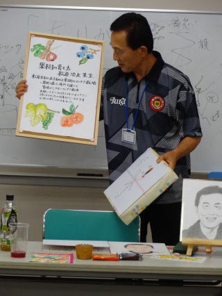 授業の最後に、松原先生にプレゼントと寄せ書きと大学祭で飾った似顔絵をお贈りして、2年間のお礼をしました。
