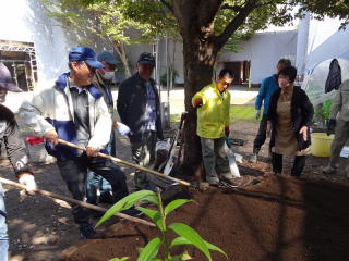 次に、木の樹勢回復のための作業を行いました。木の周りの草を草刈り鎌で取り除き、更に草の根を取り除き、バーク堆肥で覆いました。また、土の中に空気を取り入れやすくするなどの改善のために、木の周りの数ヶ所を電動穴掘り機で穴をあけバーク堆肥を入れました。