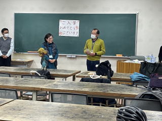 <学科長の挨拶、花瓶の菊の花の紹介も!> <二人ずつ前に出てお互いに自己紹介>