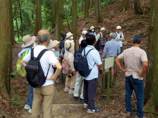 谷口先生監修の現地説明版により古墳全体の解説を受けた後、古墳を回遊し、尾根の成型、段築、葺石、埴輪などの説明を受け、古墳の構造、構築法を理解しました。