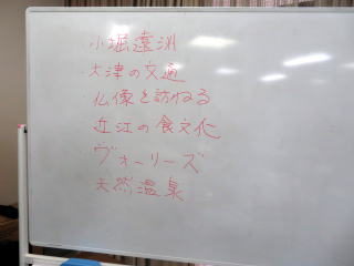 24個のみんなから提出されたテーマに一人3票ずつ投票した結果が発表され、「小堀遠州」「大津の交通」「仏像を訪ねる」「近江の食文化」「ヴォーリス」「天然温泉」の6個のテーマが選出されました。