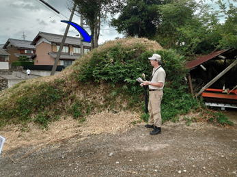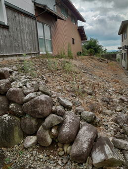 集落内の空き地にこんもりした土塁。図面等での説明がなければ土塁とは判別できません。