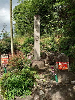 鯰江城は愛知川の断崖を活かして築かれ、川から城への上り道は細道1か所という防御に有利な地形であった。石碑は県道からの入り口付近に立っている。