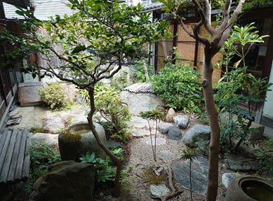 町家である主屋(おもや)の他、蔵や昭和初期に建てられた2階建ての離れがあり、大広間のザシキからは中庭が望めます。