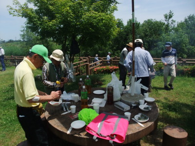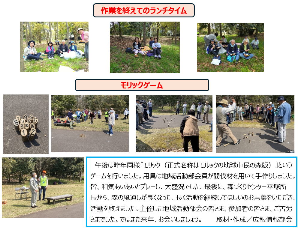 昼食後は、以前のバーベキュー大会に代わる 初の試みとして「モリック」ゲームを行いました。 元々は「モルック」が正式名称で、 「モリック」は地球市民の森のオリジナル名。 モリックの用具は、地域活動部会の会員が 間伐材を利用して |