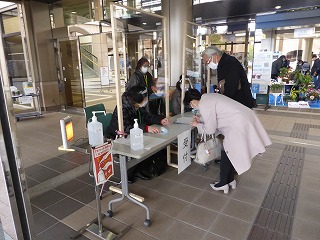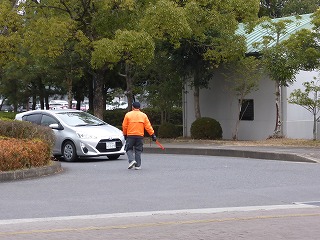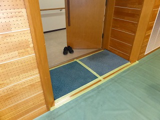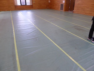 体育館の床の養生 体育館入り口の養生 開始前の委員長の全体説明