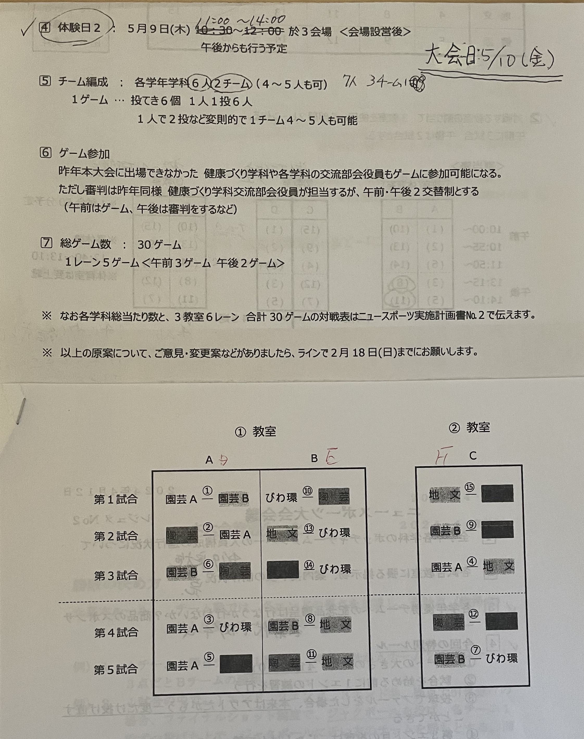 ・下期 予定表とイベント会議様子(ニュースポーツ大会,大学祭)