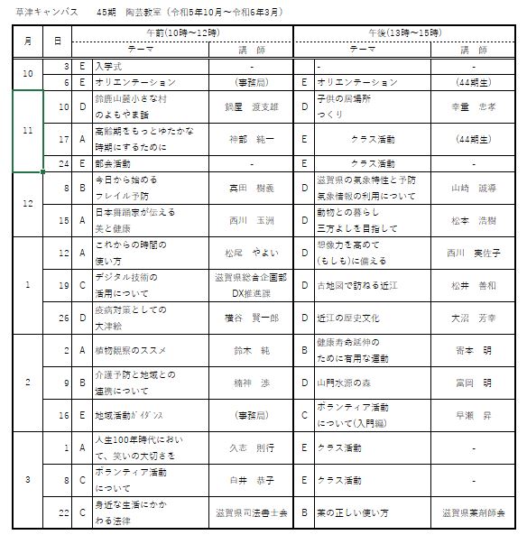 楽しく豊かに生きるための基礎講座・学校行事履修計画 (令和6年10月~令和7年3月) 草津キャンパス