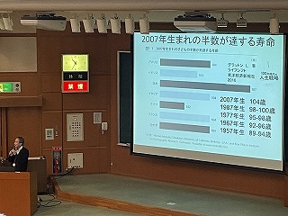 2月9日 金曜日 午前 B ・介護予防と地域との連携との連携について ~健康、働くをキーワードにした 実践事例からの新たな展望~ 講師:楠神 渉 驚き 2007年ごろ生まれた子供達の寿命は104歳 1987年ごろ生まれた人達は 98~100歳 エッ・・・・ 本当に 人生100年時代が目の前まで来てます。 |
