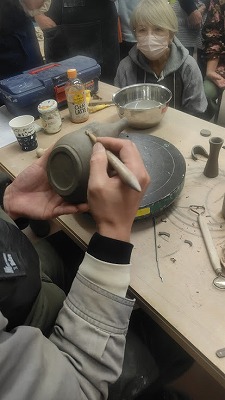 2年生後期は、講師の岡田 勲さんとサポーターさん3名の指導をうけながら陶芸の基礎や手法を学び、