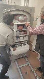 これから窯入れ作業です。個性豊かな作品が並んでいます。わずか半年足らずでこんな壷が私達につくれたんです!素晴らしい!高さが似ているものを1段にいれて、窯の高さいっぱいに詰めていきます。焼成窯を閉めて電源を入れる際には、マニュアルを声を出して読み確認します。2班が担当です。 |