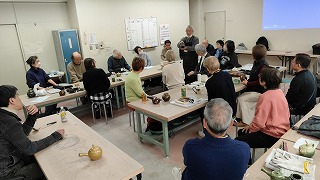実践報告者西村千代美さん(43期健康づくり学科) 田上上学区でサロンいっぷくを月1回おしゃべりしようとレイカディア大学卒業後にみんなが楽しく集まれる場所づくりをされています。コーヒー1杯から昼ごはんを提供され、近隣以外の町外からの参加もあるそうです。サロンの参加者には、友達を誘って来てくださいと声掛けされています。食べておしゃべりだけでない、認知症カフェの委託されているそうです。今後は、買い物支援の応援も考えておられると伺いました。 実践報告者 木村 健治さん (44期園芸学科) 高島で中央まちカフェ「てきてく」をされています。※一滴のしづくから広がる歩いて行けるテクテク 高島市は高齢化率40%だが駅前の高齢化率は低い環境で活動されています。シニアの力で子どもたちに安心と希望を!と語たられたのが印象に残りました。 野鳥に親しむ会、民族衣装を楽しむ、オカリナ、台風の備えより(アイラップで湯せん)、ボッチャ、モルック、カローリング、囲碁ボール、クリスマス会、焼き鳥、もちつき、ドラム缶窯(制作)など聞いているだけで楽しそうなメニューを準備されるスタッフのエネルギーに感動しました。今後は、生活環境(ゴミ)活動にも取り組むことも考えておられました。 実践報告者 佐本 光彦さん (45期びわこ環境学科) 3名のレイカディア大学卒業生からボランティア実践報告を聞きました。 |