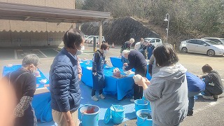 素焼きした作品を釉薬につける作業も初めての経験。先ずは、釉薬をつけない底に、揮発性の撥水剤を筆でぬりました。次に、呉須とベンガラで下絵を描きました。そしてうわぐすりの釉薬を厚さがはがき3枚ぐらいにつくようにと聞きながら作業。バケツの中へ素手で作品をつけるはドキドキです。 2025,3,3 |