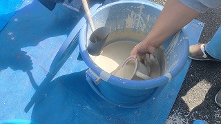 ![]() 素焼きができた「うずくまる」 ![]() 3人の助手さんが釉薬の準備をしてくださいます。好みの釉薬を1色かけする人や2重かけする人など各自が工夫されました。掛ける前には再度かき混ぜることや釉薬の付いた手はバケツで薬を落としてから水道で洗うことなどやっています。 |