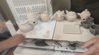 | ①まず1日目、急須か土瓶か決めてイメージ図を描きます。 ②神﨑先生が急須の胴部分、ふた、注ぎ口、持ち手、茶こしの部品を見本を制作されるのを見学します。 ③各自の作業机で昼休みを短くしたり、残業して2日目の削りと合体のために部品を制作するのに必死です。今日までに学んだ手法を思い出しながら制作しますが、この課題は超難しいです。できあがりを想像しながら熱心に制作に励みました。 ④乾きすぎないように、ナイロンなどをかけて一晩おきます。 ⑤2日目の朝、私は遅刻したのかと勘違いしたほど、皆さん早朝より作業をされていました。 ⑥2日目も神﨑先生が急須の胴部分、ふた、注ぎ口、持ち手、茶こしの部品を組み立て仕上げられるのを見学します。先生の見本は取っ手で急須が立ったので驚きです。 ⑦手びねりで作った胴体部分の削りは、肉厚を均等に薄く軽くするイメージです。底の高台部分は、5mm弱でを穴が開かないように注意しながら削ります。お茶碗で経験していましたがかっこよく削るのは思い切りが大事かもしれません。 ⑧胴体の削りが終われば、轆轤の中心において、注ぎ口を付けます。茶こしと持ち手の大きさに印をつけてから、穴をあけます。茶こしは外側からはめ込みドベで胴体につけます。その上に注ぎ口を水が入る高さを確認しながら取付、お茶が尻もれしないように口先ををカッターナイフで斜めに切り、口の先端を滑らかにしました。次にその注ぎ口から直角より少し内側に持ち手をつけていきます。時計の47分の場所へ、かぶせるように胴体にヘラなどで傷をつけてドロドロのドベをのせるようにつけて接着します。 ⑨土瓶を制作する時は、注ぎ口と蓋の中心と両端の手を付ける部分が一直線にすることが求められます。 ⑩お疲れ様でした。2日でここまで仕上げ、次は素焼きまで乾燥です。 |