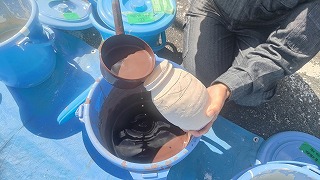 天候がよく屋外での作業。釉薬は見た目の色と焼成後の色が違うので仕上がりを想像して薬がけしました。壷の中にも釉薬を入れて、全体に薬がかかるようにくるっと壷を回して余った薬をバケツに戻します。外と中の薬が違ったり、下地にさらに別の釉薬で変化をつけたりと工夫される人もありました。焼き物はいくつもの工程が必要と分かってきて、作品にも愛着がわきます。 |