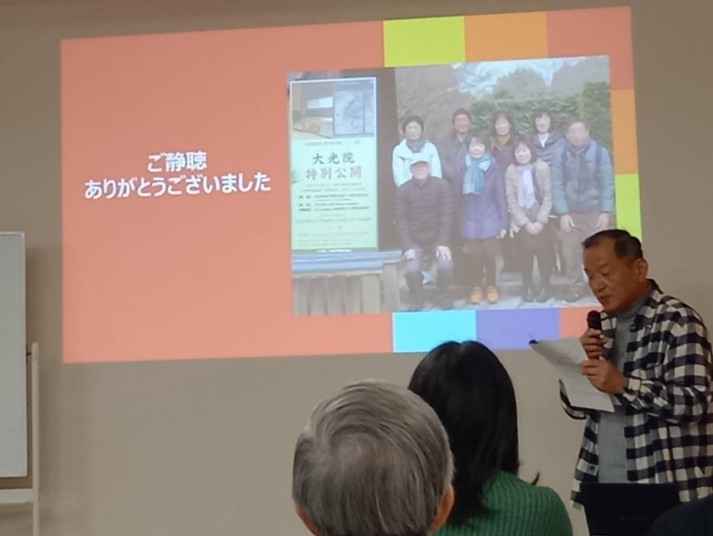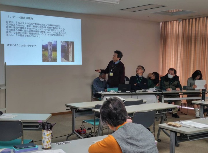 ・レイカディア大学では、グループで調査・研究を行うことを通し、地域課題の抽出や仲間づくり・まちづくりの取組み方法を身につけるため、課題学習が実施されます。 ・46期地域文化学科では、令和7年(2025年)9月に各学生が興味を持つ分野でグループ分けを行い、グループ毎にテーマ、具体的な内容、役割分担、フィールドワーク先等の検討を行いました。その後、著書・文献等で研究を行うとともに、テーマに関わりのある現地に実際に出掛け、フィールドワークを行って内容を深めていきました。 ・最終的には、課題学習の成果を「課題学習報告書」としてとりまとめるとともに、令和8年(2026年)8月の課題学習報告会で全学生の前で発表を行うことになりますが、それに先立ち、中間報告会を開催し、クラスメンバーの前で各グループが発表を行いました。 ・発表のテーマとグループ名は次表のとおりです。また、各グループの発表後、講師の旅行作家西本梛枝氏にご講評いただき、最終報告に向けてご助言をいただきました。