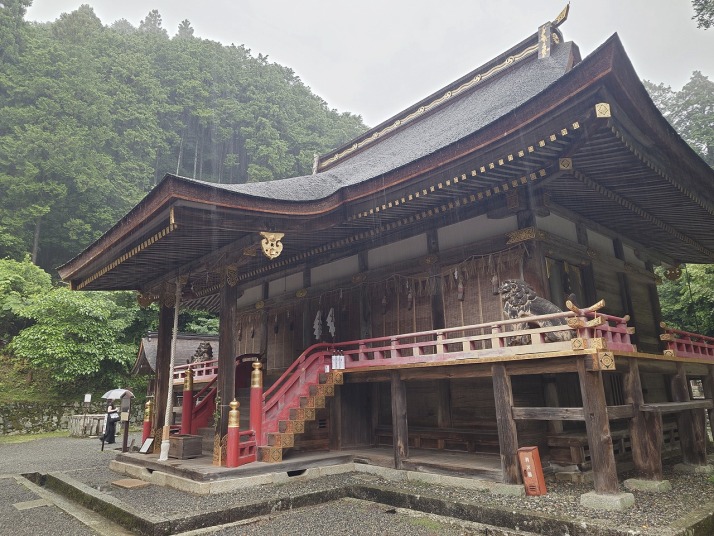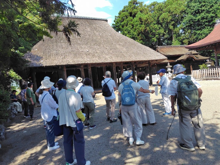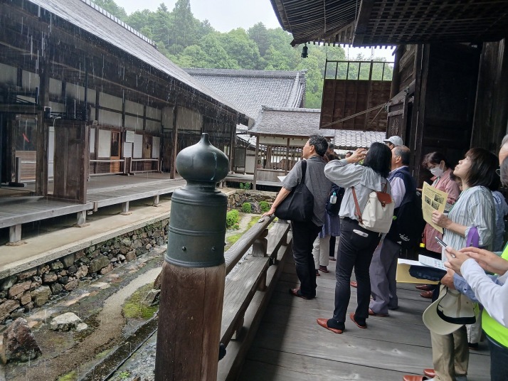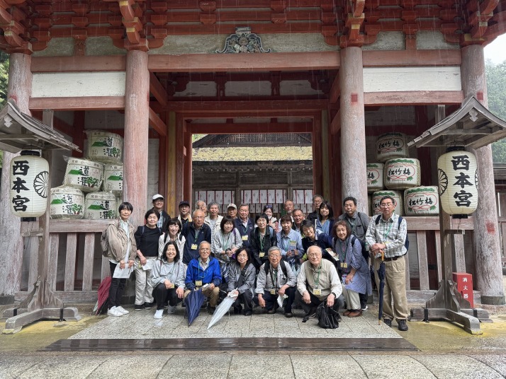 ・午前は、滋賀県文化スポーツ部文化財保護課の長谷川聡子先生の案内により西教寺(大津市坂本五丁目)を見学しました。長谷川先生から、西教寺の縁起や明智光秀との関わりなどの概要を説明いただいたあと、重要文化財(以下、「重文」)である本堂および客殿それぞれの建物の構造、屋根や柱、欄間、装飾などの建造物の特徴を中心に詳しく解説していただきました。 ・午後は、同文化財保護課の福吉直樹先生の案内により日吉大社(大津市坂本五丁目)を見学しました。長谷川先生からは、雨が強まる中、西本宮の楼門(重文)、拝殿(重文)および本殿(国宝)ならびに東本宮の楼門(重文)、拝殿(重文)および本殿(国宝)などの建造物の構造、屋根や柱等の特徴について詳しく解説していただきました。また、最後に大宮川に架かる二宮橋、走井橋、大宮橋の日吉三橋(重文)と日吉大社独特の山王鳥居について説明いただきました。 |