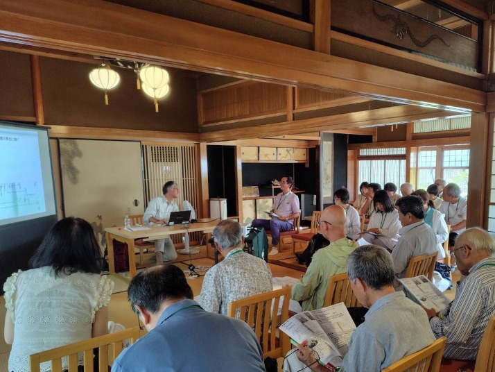 ・午前中は、地元の観光ガイドさんの案内により高島市旧高島町内を巡りました。万葉の時代に「香取の海」と呼ばれる入り江だった「乙女ヶ池」、明智光秀の縄張りによって築城され、織田信澄(信長の甥)が初代城主だった「大溝城跡」、江戸時代に大溝藩主分部(わけべ)氏によって整備された「大溝陣屋」の「総門」、城下町の町割りの整備によってつくられた飲用・防火用の生活用水路である「町割り水路」などを見学しました。 ・午後は、高島市旧安曇川町に移動しました。講師の西本梛枝先生の案内により、王陽明の生地中国浙江省余姚市との友好交流を記念して建設された中国式庭園「陽明園」、近江聖人といわれた陽明学の祖、中江藤樹を敬慕する人々の協力により建てられた「藤樹神社」、「中江藤樹墓所」がある「玉林寺」を巡りました。その後、中江藤樹の住居・講堂跡である「藤樹書院」において、「藤樹書院」の上田藤市郎先生から「藤樹書院」のあゆみ、藤樹の人柄、教えについて学びました。上田先生は、「愛敬」「到良知」「五事を正す」など藤樹が説いた理念をユーモアを交えわかりやすく説明されるとともに、地元の小学3年生が将来の夢を作文に書いて「藤樹書院」に奉納し、それを成人式に受け取る行事が続いていることなど、藤樹の教えが地域の人々に愛され、根付いていることを教えていただきました。 |