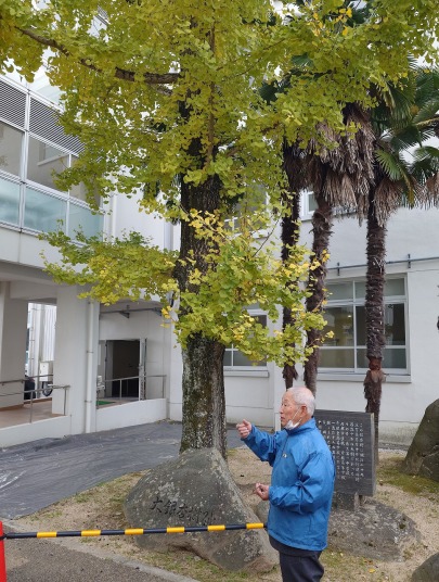 | ②大銀杏 | ③道中着の着方を教える粕渕先生 |