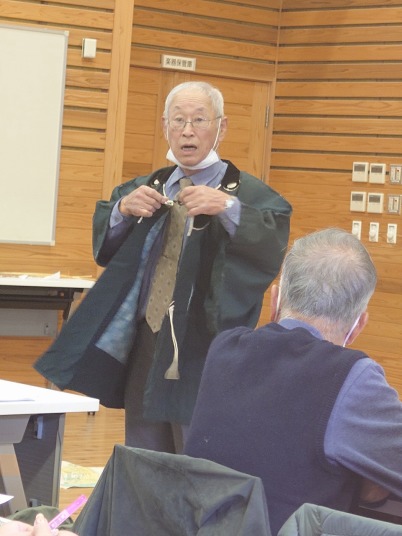 ・粕渕先生が収集された火打石を受講生に回して火打ち体験をするなど、昔の人が使った火きり具や除雪具などについて学び、追体験を行う実験的民俗学の重要性について説かれました。 ・伊吹山文化資料館を見学し、伊吹山の自然や歴史、養蚕やもぐさなど伊吹山の恵みとなりわい、昔の人々の暮らしなどについて粕渕先生が展示物の解説をしてくださいました。 |