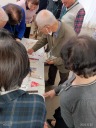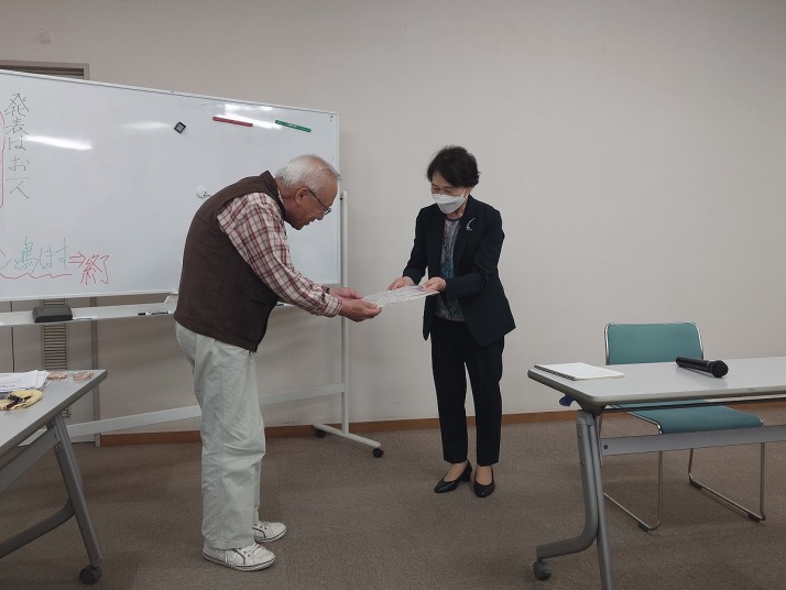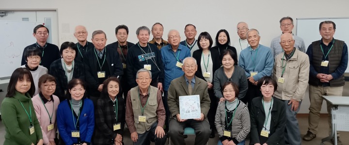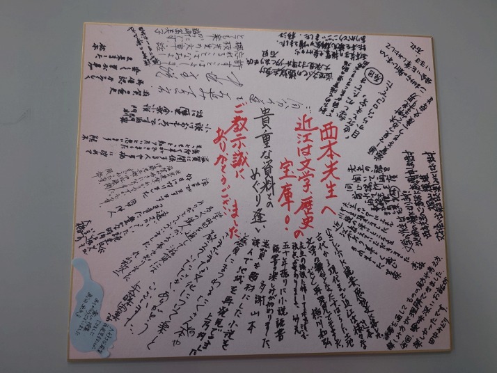 | ①西本先生を囲んで | ②感謝の色紙贈呈 | ③色紙 | ||||