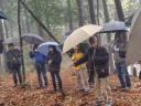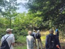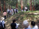 ・前方後円墳など古墳の形式や荒神山古墳の特徴などを学んだ後、小雨がぱらつく中荒神山古墳に赴き、谷口先生から後円部や前方部の形状等の説明を聞きました。 | ||