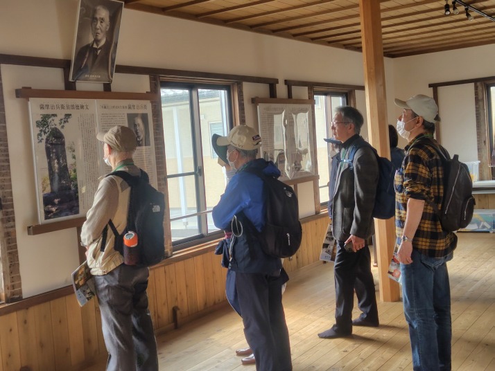 ・西本先生に案内・解説していただきながら、犬上郡豊郷町の「先人を偲ぶ館」、「薩摩治兵衛記念館」、「豊郷小学校旧校舎群」、「伊藤忠兵衛記念館」を訪ねました。 ・「先人を偲ぶ館」では、豊郷病院を設立した伊藤長兵衛、豊郷小学校の建設に寄与した古川鉄治郎、一代で巨万の富を築き「木綿王」と呼ばれた薩摩治兵衛、その孫でバロン(男爵)サツマと呼ばれた薩摩治郎八、伊藤忠・丸紅の創始者伊藤忠兵衛など豊郷が育んだ郷土の先人達の活躍について遺品などの展示物や説明パネルを見ながら学びました。 ・「薩摩治兵衛記念館」は、明治20年に新築された旧豊郷尋常高等小学校本館で、初代・2代薩摩治兵衛、そして、獅子文六著「但馬太郎治伝」の太郎治のモデルとなった薩摩治郎八の活躍を記したパネルや写真が展示されていました。 ・「豊郷小学校旧校舎」は丸紅の専務古川鉄治郎が私財の2/3を寄贈し、ウィリアム・メレル・ヴォーリズの設計により建設され、「白亜の教育殿堂」「東洋一の小学校」として町民に愛されてきました。最近は、アニメ「けいおん!」の主人公らが通う高校のモデルとなったといわれ、聖地巡礼に多くのファンが訪れています。 ・「伊藤忠兵衛記念館」は、伊藤忠・丸紅の創始者伊藤忠兵衛の旧邸、二代忠兵衛の生家に彼らの愛用の品などが展示され、初代忠兵衛と八重夫人の当時の暮らしぶりや近江商人の精神について記念館のガイドの方から学びました。 |