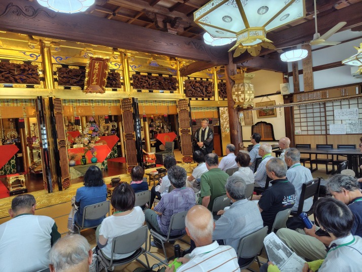 ・午前は、能登川コミュニティセンターにおいて講師の山本一博先生が、「有言実行 比叡山の焼討」と題して、まず、元亀元年(1570年)の元亀争乱のうち、近江での滋賀(志賀)の陣や比叡山焼き討ちについて説明されました。 ・特に、午後から見学する予定の志村城(址)のことや、伊庭の川原崎助右衛門のことなど能登川地域に関わることについて詳しく教えていただきました。 ・午後は、まず、東近江市新宮町に向かい志村城址周辺を見学しました。志村城は、志村氏(新村氏)の代々の居城で、元亀2年(1571年)信長勢の佐久間重盛らが攻撃し、首670人を討ち取ったところです。志村城址の外堀であった「さかさ川」、「殿様の墓」、多量に掘り出された石仏が集められた墓地などを山本先生に案内いただき詳しく説明していただきました。 ・次に、伊庭集落に移動し、連歌で有名な伊庭出身の宗祇の歌碑、明治29年(1896年)の洪水水位の石碑、伊庭城石垣跡を山本先生に案内していただき、正厳寺に向かいました。 ・正厳寺本堂では住職から、お寺の歴史、川崎助右衛門の功績とそれを讃える境内にある「愛郷流水の碑」のことを詳しく教えていただくとともに、本堂にある「光明本尊」という掛軸の複製を間近で見せていただきました。 ・その後、山本先生の案内で、天正7年(1579年)の安土宗論における浄土宗側の論者貞安が住職だった「妙金剛寺」や葦葺きが特徴的な「仁王堂」がある「大濱神社」などを見学し詳しく説明いただきました。 |