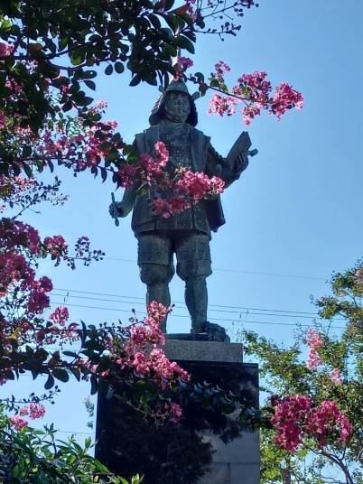 | ⑱蒲生氏郷公像 (蒲生郡日野町上野田) 日野町上野田にあるひばり野公園には、蒲生氏郷公の銅像が立っています。銅像の下には次の案内板が掲げられています。 【蒲生氏郷公】 戦国大名蒲生氏郷は、弘治二年(1556)日野の中野城で、六角家の家臣蒲生賢秀の子(幼名鶴千代)として生まれる。やがて蒲生家は織田信長に従い、元服した鶴千代は忠三郎賦秀と名乗り、信長の息女を妻とした。天正十年(1582)本能寺の変の際には、明智光秀に応じず、信長の妻子を日野にかくまっている。 信長の死後は羽柴(豊臣)秀吉に従い、天正十二年、戦功により伊勢松ヶ島十二万石に移封となった。翌年名を氏郷と改め、のちに松坂城を築き城下を整備した。 天正十八年小田原役後、秀吉は氏郷を奥羽の要として会津黒川四十二万石に封じた。翌年に秀吉の命で千利休が切腹した際には、利休の次男でのちに三千家の祖となる少庵を会津にかくまい、千家の再興に貢献した。 文禄元年(1592)会津黒川を会津若松と改名し、城下の整備を行ったが文禄四年に病により四十歳で京にて没した。当時の石高は九十二万石で、豊臣・徳川・毛利氏に次ぐ四番目の大大名となっていた。 辞世「限りあれば 吹かねど花は散るものを 心短き春の山風」 この銅像は、文禄元年の朝鮮出兵で肥前名護屋に出陣する際に武佐の辺りより郷里の綿向山を望み 「思いきや 人のゆくえぞ定めなき わがふる里をよそに見んとは」と詠んだときの姿を表わしたものである。 ※ 写真をクリックすると拡大画像を見ることができます。 |