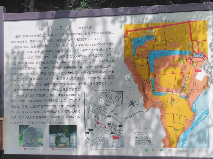 | ③中野城跡(1) (蒲生郡日野町西大路) 日野川ダム沿いの案内板には次のように記されています。 【中野城跡】 大字西大路 日野川右岸の河岸段丘城に位置し、日野谷の中野の地に築かれたので中野城と呼ばれますが、史料上は「日野城」「蒲生城」などと表記されています。 築城年代は、文亀4(1504)年、大永4(1524)年、天文年間(1532~55)など諸説があります。築城には約3年の年月を要し、延べ10万人余の人夫が動員されたと伝えられています。定秀(さだひで)・賢秀(かたひで)・氏郷(うじさと)と3代にわたる蒲生家の居城となり、現在の日野市街地は当城の城下町として整備・発展したものです。天正10(1582)年におきた本能寺の変の際には、賢秀・氏郷親子は織田信長の妻子や女房衆を安土城から当城へ退避させました。天正12年に蒲生氏が伊勢国松ヶ島(三重県松阪市)へ転封となった後、慶長年間(1596~1615)に廃城となりました。江戸時代には、仁正寺(にしょうじ)(のちに西大路と改称)藩主市橋長政(いちはしながまさ)が当城址の北東部分に陣屋を構えました。 第二次世界大戦後の開墾や日野川ダム建設工事などにより旧状は大きく改変され、現在では本丸跡の北側を中心に土橋、土塁や堀の一部が残るだけとなってしまいました。なお、土塁上に建つ神社や石垣は江戸時代のものです。また、本丸跡には復元整備された井戸跡があります。これは氏郷公産湯の井戸と呼ばれ、氏郷出産の際に産湯として使われたと伝えられています。 ※ 写真をクリックすると拡大画像を見ることができます。 |