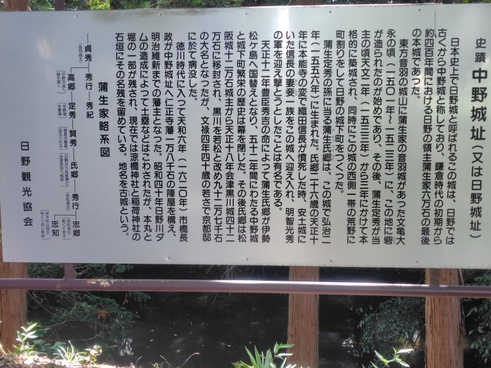 | ⑦中野城跡(5) (蒲生郡日野町西大路) 中野城跡に掲げられた案内板には次のように記されています。 【史蹟 中野城址(又は日野城址)】 日本史上で日野城と呼ばれるこの城は、日野では古くから中野城と称しており、鎌倉時代の初期から約四百年間における日野の領主蒲生家六万石の最後の本城であった。 東方音羽の城山に蒲生家の音羽城があった文亀大永の頃(1501年~1523年)に、この地に砦が造られたのが始めであり、その後、蒲生定秀が当主の頃天文二年(1533年)から三年にかけて本格的に築城され、同時にこの城の西側一帯の荒野に町割りをして日野の城下町をつくった。 蒲生定秀の孫に当たる蒲生氏郷は、この城で弘治二年(1556年)に生まれた。氏郷二十六歳の天正十年に本能寺の変で織田信長が憤死した時、安土城にいた信長の妻妾一族をこの城に迎え入れ、明智光秀の軍を迎え撃とうとしたことは有名である。 天正十二年豊臣秀吉の命によって蒲生氏郷が伊勢松ヶ島へ国替えとなり、五十二年間にわたる中野城と城下町繁栄の歴史は幕を閉じた。その後氏郷は松阪城十二万石城主から天正十八年会津黒川城四十二万石に移封され、黒川を若松と改め九十二万七千石の大名となったが、文禄四年四十歳の若さで京都邸に於て病没した。 徳川時代に入って天和六年(1620年)市橋長政が中野城址へ仁正寺藩(にしょうじはん)一万八千石の陣屋を構え、明治維新までの藩主となった。昭和四十年日野川ダムの造成によって土塁などはこわされたが、本丸と堀の一部が残され、現在では涼橋神社と稲荷神社の石垣にその名残を留めている。地名を古城(ふるしろ)という。 蒲生家略系図(記載省略) 日野観光協会 ※ 写真をクリックすると拡大画像を見ることができます。 |