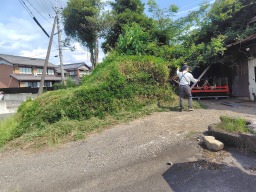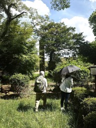 ⑪鯰江(森村)城址(4) (東近江市鯰江町) 鯰江町自治会館の裏手には土塁跡であることがはっきりとわかる場所があります。 なお、現在の鯰江町は、幕末に森村から鯰江村に改称されていることから、「信長公記」に記載されている「鯰江の城」は、森村にあった城と、中戸城をあわせたものではないかという説明を山本先生から伺いました。さらに、井元城が②に記載したように信長軍の付城ではなく六角氏側の城ではないかという考え方によると、「信長公記」に記載されている「鯰江の城」は、森村城、中戸城および井元城のことではないかとも考えられるとのことです。 |